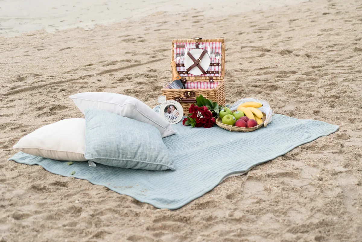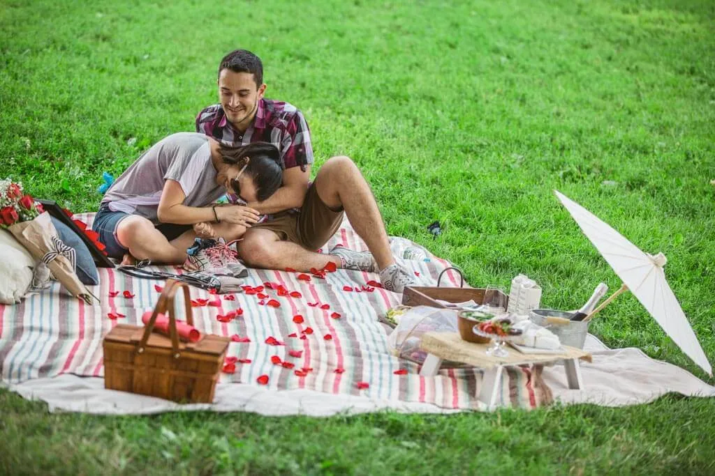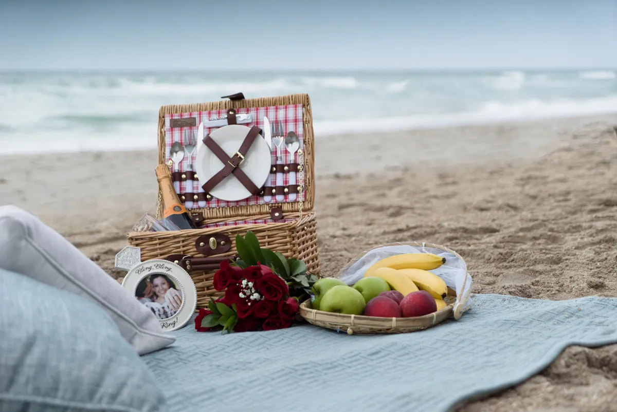 – Picnic blanket, picnic basket, bottle of apple cider, fruit plate, 2 pillows, 15 Red Roses