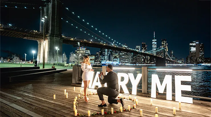 Night Proposals: As the dusk settles, New York turns into a twinkling wonderland, an enchanting backdrop that infuses glamour into your proposal. Among our favored locations are the iconic Top of the Rock, the mesmerizing Brooklyn Bridge, the Central Park gazebo with its stunning city skyline view, a private rooftop featuring the Empire State Building as a backdrop, and the Dumbo area where the Brooklyn Bridge and city lights frame your unforgettable moment. Although sunset proposals are breathtaking, they often draw crowds. Hence, proposing after sunset, when the city still shimmers but the crowds have dispersed, can be an excellent alternative. The city's romantic allure under the starlit sky, the night canvas dotted with myriad city lights, can make your proposal magical, creating a blend of intimacy and drama for your extraordinary moment.