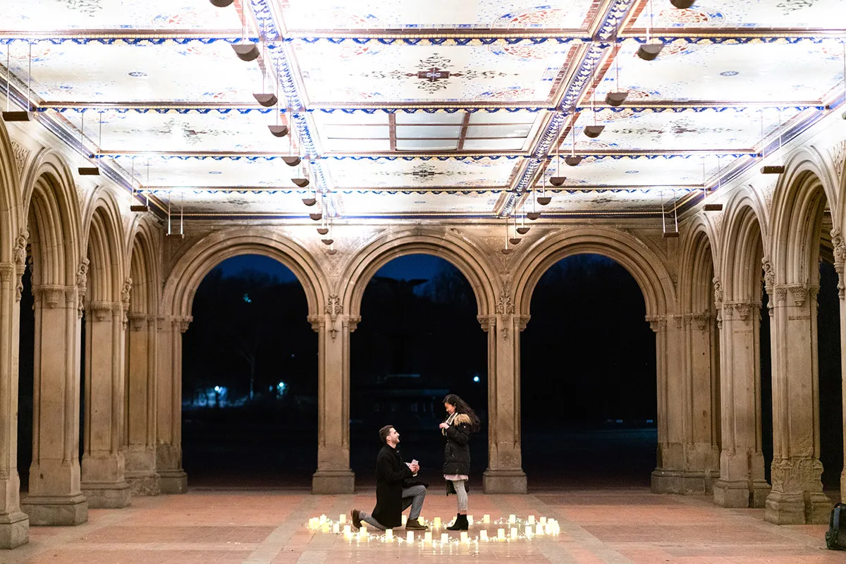 - Weather: New York’s weather can be unpredictable, so check the forecast as your proposal date approaches. Have a backup plan in case of rain or extreme temperatures. Locations with some shelter, like Bethesda Terrace Arcade or Cop Cot, can be great options if the weather turns.