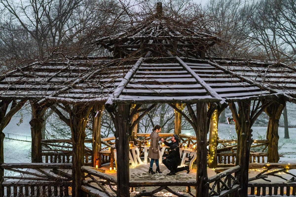 This package is ideal for Holiday engagement. The secret gazebo is lightened up by the 150 Led candles and string lights just glowing in the dark, beautiful Manhattan skyline on your background and secret proposal photographer taking pictures. This is a private proposal idea for Central Park. Perfect for the couples, who want to be outside but still have their privacy. One of the best Holiday engagement proposal ideas in New York.