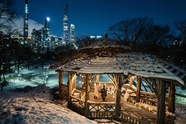 Step into a winter fairytale in the heart of New York. Picture a secret gazebo covered in snow, surrounded by flickering candles and soft fairy lights, with the city skyline glowing in the distance. It’s intimate, elegant, and effortlessly romantic — the perfect setting for your once-in-a-lifetime question. A moment she’ll never forget, frozen in time and forever captured by your secret photographer.