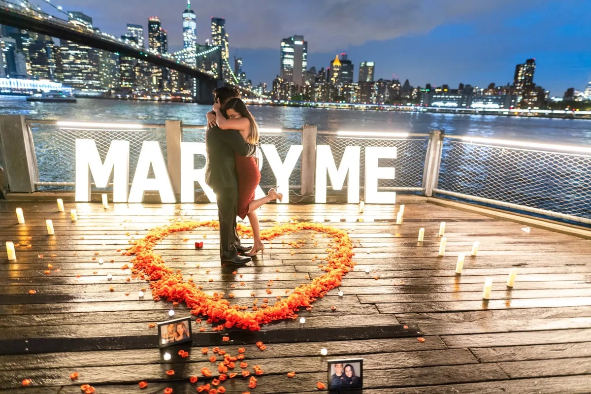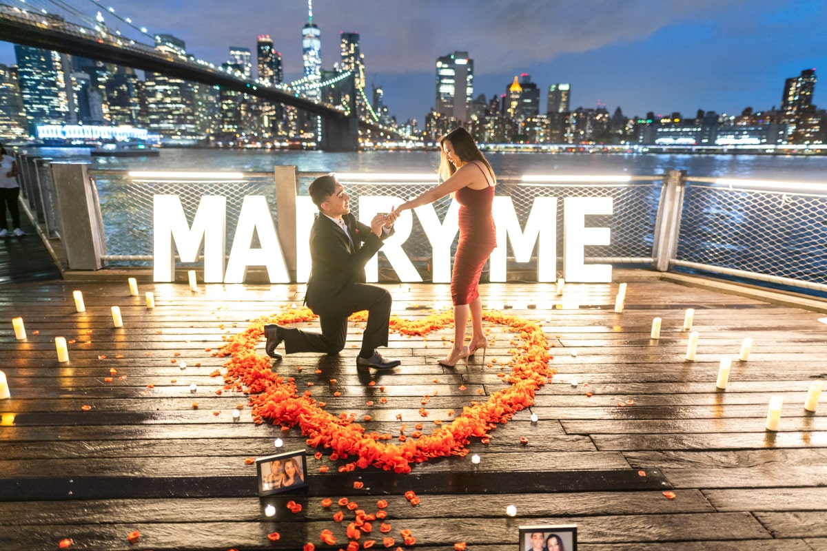 Imagine walking along the boardwalk in Dumbo, Brooklyn, and stumble upon a beautiful sign that says ” Marry Me” and a candlelight heart. Your partner is sure that it is not for you and trying to walk you out of the proposal spot, but you get on one knee and propose. She is in shock and can’t believe you plan all that without her knowing it. But how exactly did you plan it?