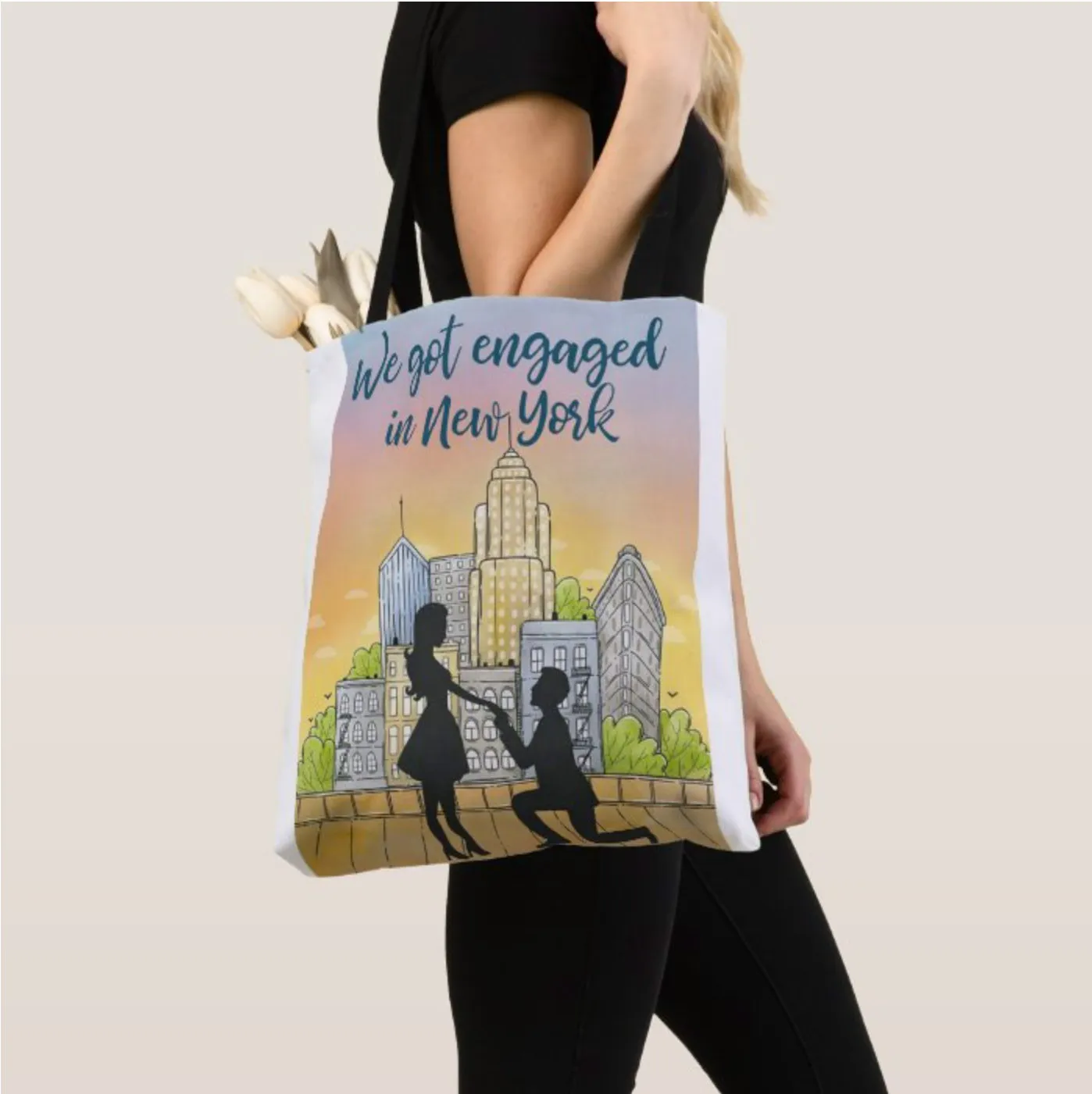 This white stylish bag with the colorful print is ideal for busy city life. Perfect for work and grocery shopping, this bag is rather big and has a generous gusset which allows you to put more in there. And of course, this is a fantastic reminder of the best day of your life.