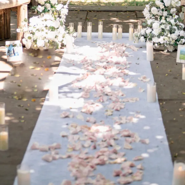 – 25 Bouquets of real roses decorations including flower heart and aisle.