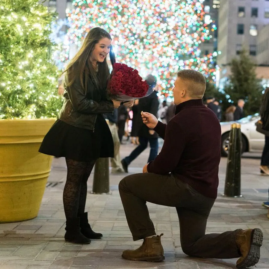 It was a regular afternoon for Albert and Cassidy. They took the usual train from Long Island to the city to meet the mutual friends. “ We go to the city every time I visit. Cassidy moved from Buffalo to Long island for school, so I visit her every month”. The couple met in college and has been together for 6 years already. For the actual proposal “I choose the Rockefeller Christmas tree because she loves it there and its romantic spot. I told her we were meeting friends to go see the sights and have dinner, so she had no idea I was about to propose”. Albert asked a stranger to pass a huge roses bouquet to Cassidy, while they were waiting by the tree. There was a little note inside saying “Say YES”. “I was very nervous prior and wanted it to be a surprise, and obviously she was very confused by the bouquet first and then surprised by the proposal. She had no idea it was coming.”