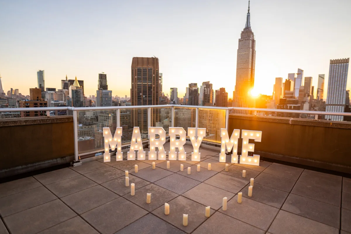 When our clients asking what is the best way to pop the question, we almost always saying “On the rooftop”. There is just something magical about the night city view, colorful Empire State Building and skyscrapers around. And it is very easy to come up with the perfect “cover”, so that your sweetheart wont get any ideas that the big question is coming.
