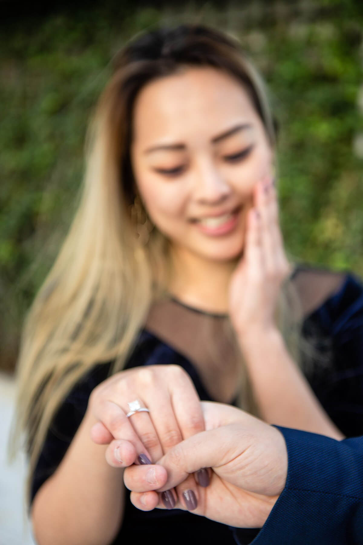 The interactive popup was full of photo ops and we even made it as the first 200 visitors! This meant that we received a mini oven sized pizza book within a DiGiorno book sleeve that plays the classic jingle when you open it. I was beyond ecstatic and so was Larry – or so I thought. He was secretly worried about having to carry this huge prop to our proposal. Afterward, we took an Uber over to the rooftop in Tribeca to grab a quick drink before dinner. We went up to the rooftop where Tatiana and Vlad (our proposal planner and photographer) had already set up a path of candles which led to a countertop table with a bottle of champagne, waiting for us. I was impressed by the elaborate setup and next thing I know, he was down on one knee with the ring, asking me to make him an even happier man by marrying him. I was overwhelmed and nodded happily while Tatiana and Vlad captured every moment of it. This was not the end. My heart was pounding as we’re winding down a familiar street to this mysterious restaurant. Entering through an unsuspecting door, we found ourselves seated at the chef’s counter at Atera where my childhood best friend worked. He knew that she would be the first person I would want to celebrate with and working in the restaurant industry meant that the only way to do so was to visit her. I’ve been dying to dine there and needless to say, the dinner was perfection. This was not the end either. He mentioned that he scouted out a cocktail bar a few blocks away for us to celebrate after dinner. I was a bit tired from the long day but reluctantly agreed. I am so glad I did. In the basement of Brandy Library, he had arranged for 40 of our closest friends to be in on the surprise and continue this celebration. One of my best friends had decorated the place with banners and balloons, a childhood friend came from out of town, another flew in from SF. Tears were streaming down my face by now being surrounded by all the love and support from people who have been dear to our hearts and who have witnessed our relationship grow over the years.