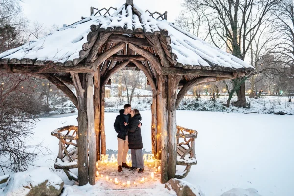 If you are really lucky, you might find this beautiful park covered in snow and it’s just an ideal setting for a Hallmark proposal. The best areas to look for around the park, will be: Gapstow Bridge, Bow Bridge, Bethesda Terrace fountain and Wagner cove. To have a full day experience at the park, enjoy the ice skating at the Wollman ice rink and have dinner at the Tavern on the Green. Besides the beautiful scenery, Central Park also has lots of semi-private gazebos, that are perfect for decorated proposal. Our ‘ premium light the night‘ , ‘ Beauty and the Beast ‘ themed decor and ‘ Harry Potter ‘ inspired decor are ideal for the winter park proposals.